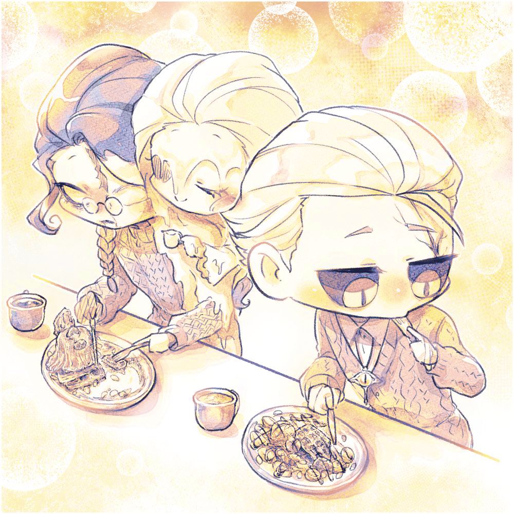 【自分が癒やされるためのアルヴァさんとフィリップくんの食べ歩きシリーズ】 アルヴァさん、一口が小さいのにいっぱい食べるからいつも時間かかりそうだなって