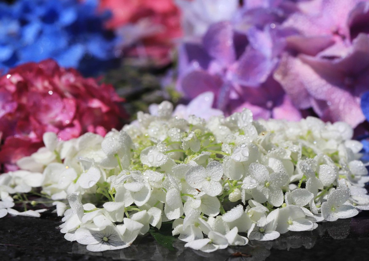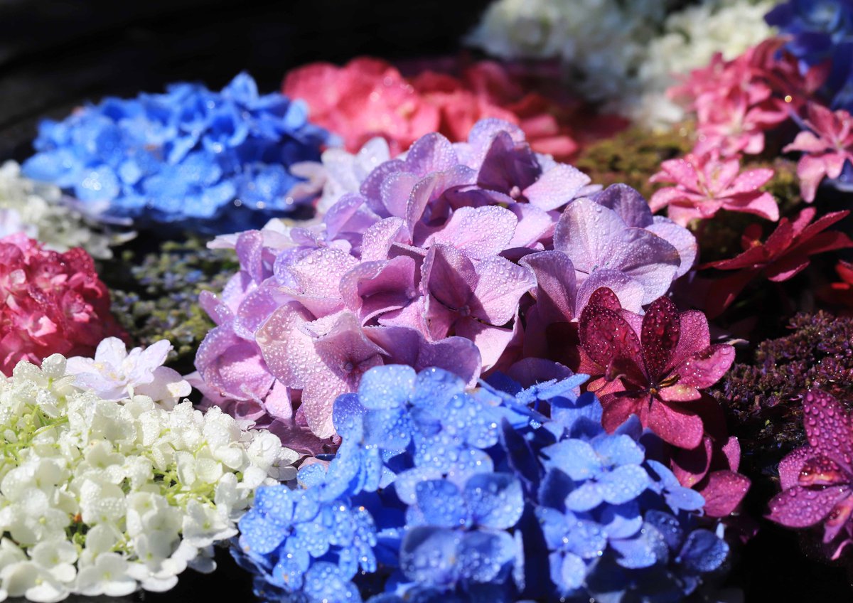 色とりどりのアジサイで埋め尽くされた、カトリック宇部教会の花手水。涼やかな美しさに魅了されます(^^) ※JR琴芝駅から徒歩3分。山口県総合庁舎隣り。