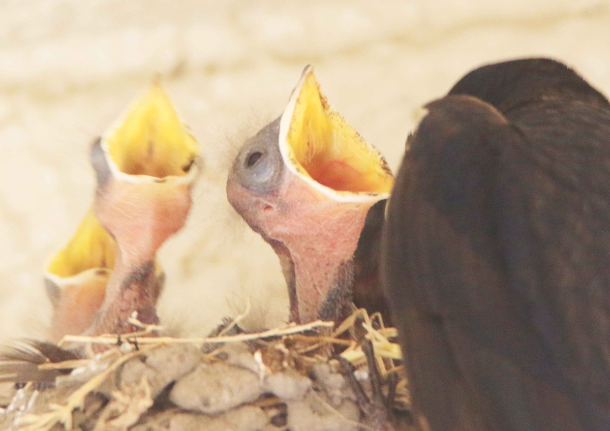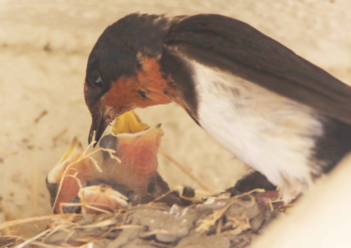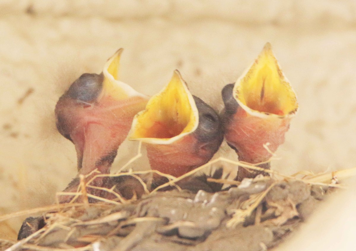 孵化したばかりのツバメの子どもたち。まだ目も開いていないようですが、親ツバメが来ると大きな口を開いて食べ物をねだります(•ө•)
