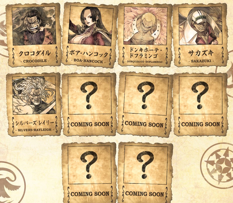 ワンピースコラボの新キャラが発表されています! かなり豪華!!🥳🥳🥳 【新発表キャラ】 ロー キャロット サボ エース 白ひげ マルコ バギー スモーカー ミホーク クロコダイル ハンコック ドフラミンゴ サカヅキ レイリー