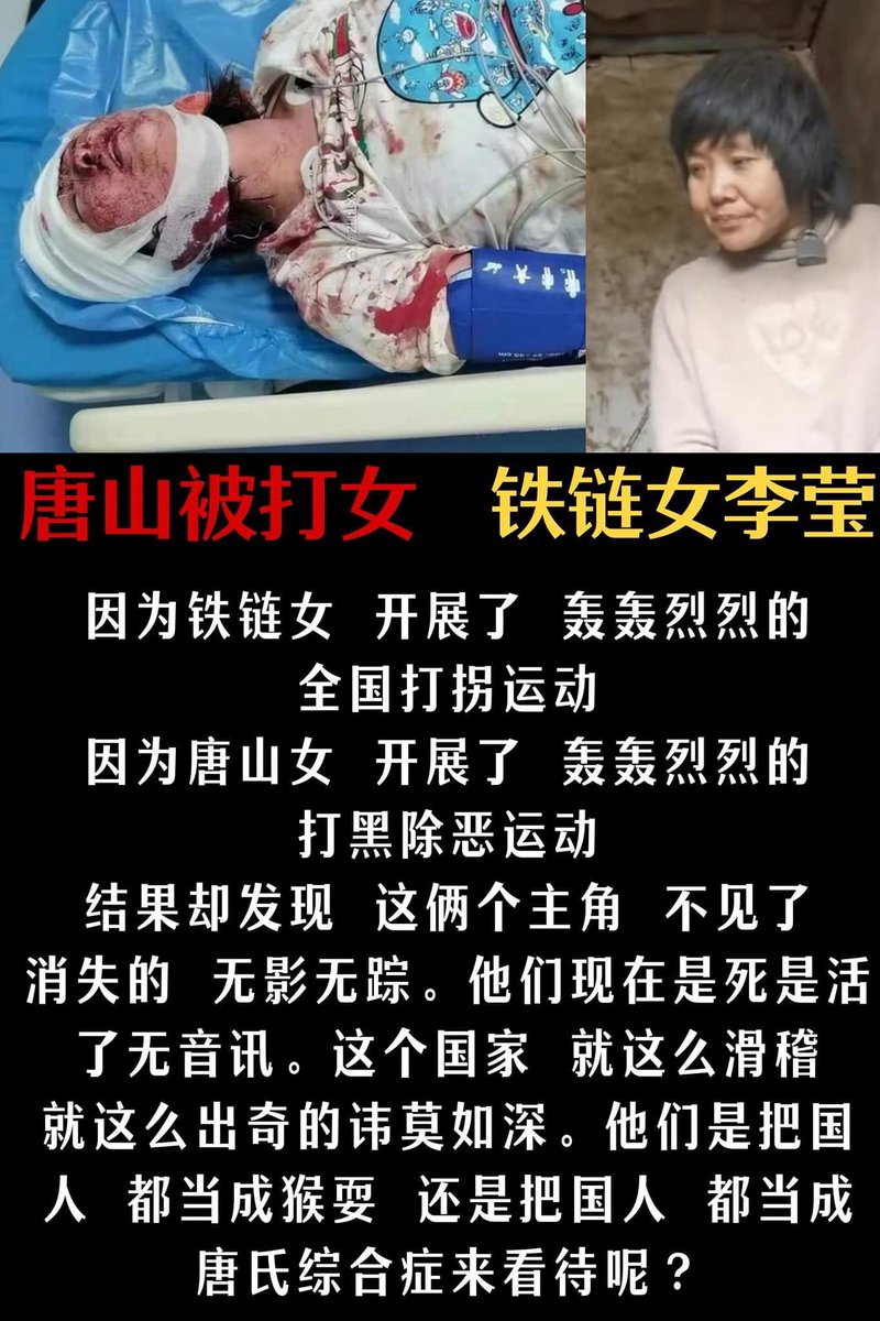 還記得江蘇人口販賣幸存者鐵鍊女李螢嗎?牙齒被扒光、嗓子被毒啞、遭受20多年董志民禽獸父子強暴,一個鏽跡斑斑鐵鏈子就是兩米不到的世界,被毒啞嗓子向蒼天啼哭訴:自己天天跟妓女一樣,一切罪惡並不是人販子,罪惡根源全是中共整個統治區域惡意製造的人權災難、不結束中共你姐妹會成為下一個鐵鍊女