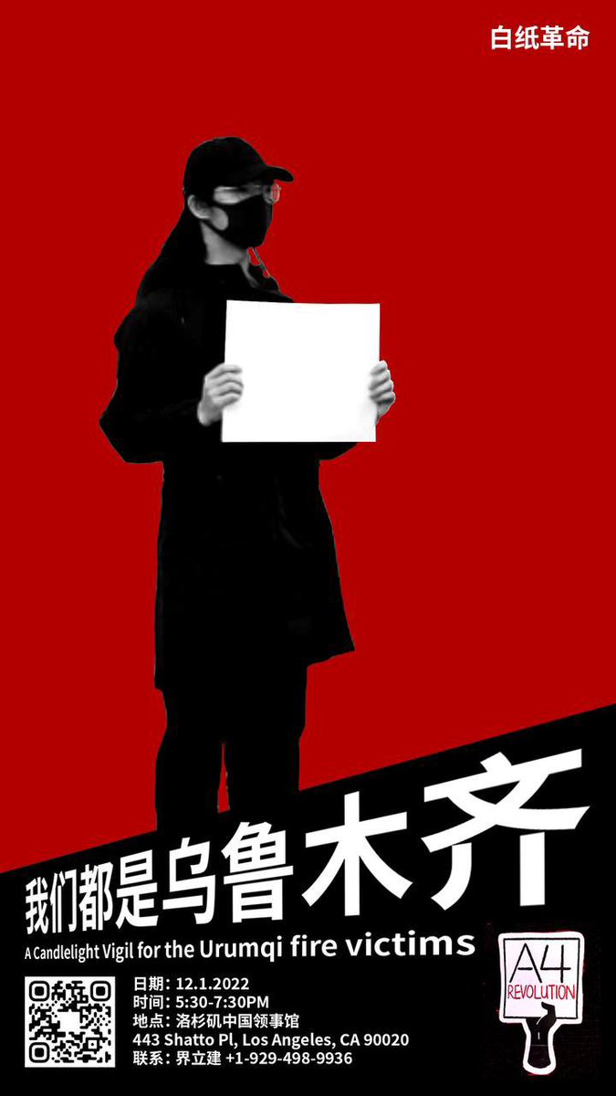 今晚洛杉磯中國領事館華人留學生悼念烏魯木齊11月24火災受害者,聲援國內白紙革命和勇敢的大學生市民。