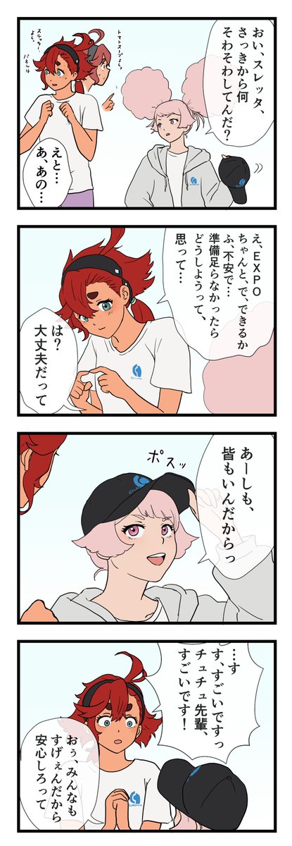 寝起きのニカチュチュ。 早起きすぎるスレッタに引く二人。