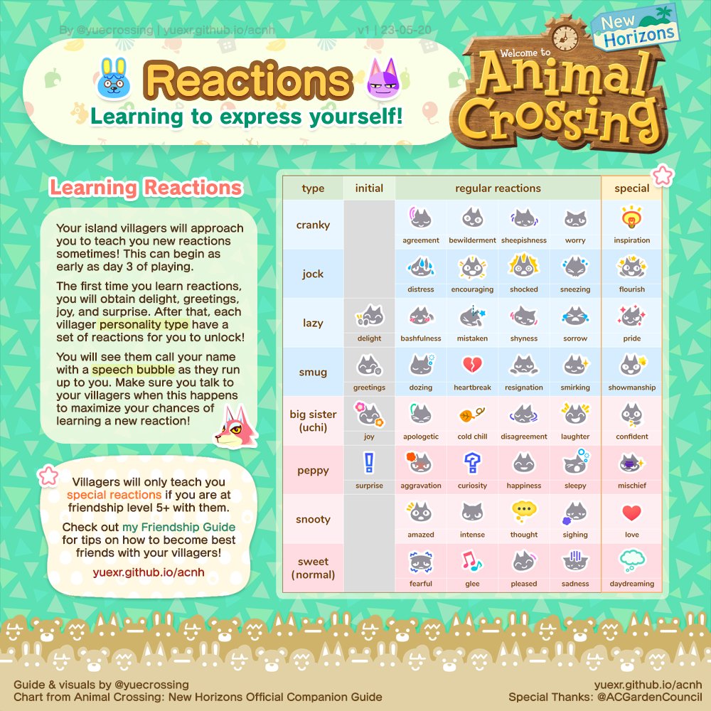 Different villager personality types have different sets of reactions for you to unlock!🥰⁉️ Special reactions can only be unlocked if you are at friendship level 5 or above with them~🔓😋