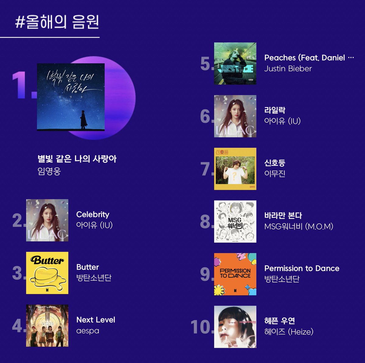 .@BTS_twt has 2 songs in the Top 10 of Genie Music’s Songs of the Year, with “Butter” (#3) and “Permission to Dance” (#9)!