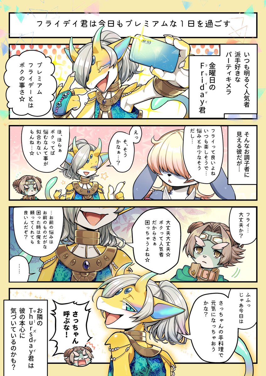 曜日キメラ四コマ企画、第五弾はFridayくん!💛本日のプレミアムフライデーにぴったり?!Fridayくんのプレミアムな日常をどうぞ🐾