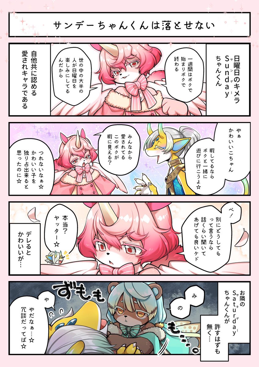毎週お届けしてまいりました曜日キメラ四コマ企画、ラストを飾るのはSundayちゃんくん!!💘一週間はSundayちゃんくんで始まり終わる・・?🐾
