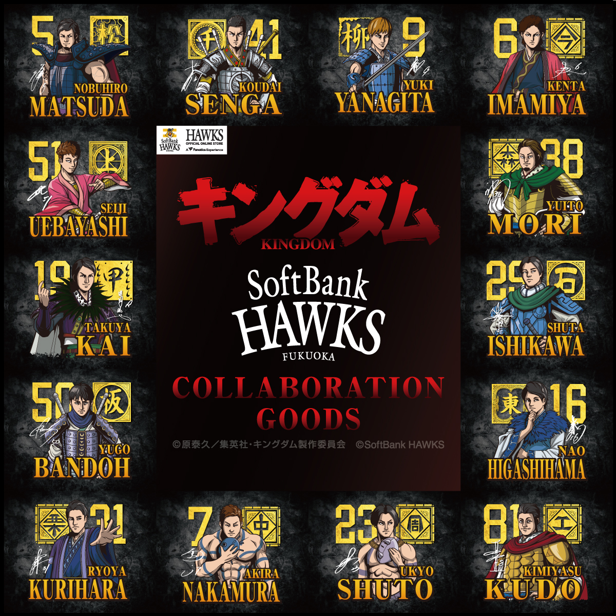 主人公の「信」、秦国の大将軍「麃公」など、人気キャラクターに扮したホークス選手全14名を描き下ろしたビジュアルが完成しました。