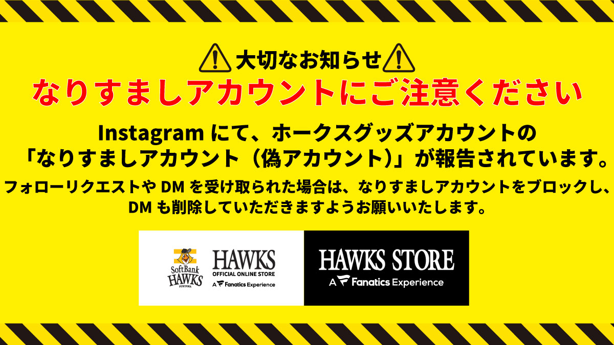 この度、ホークスグッズアカウントを装った「なりすましアカウント(偽アカウント)」が再度出現しているとのご報告をいただきました。