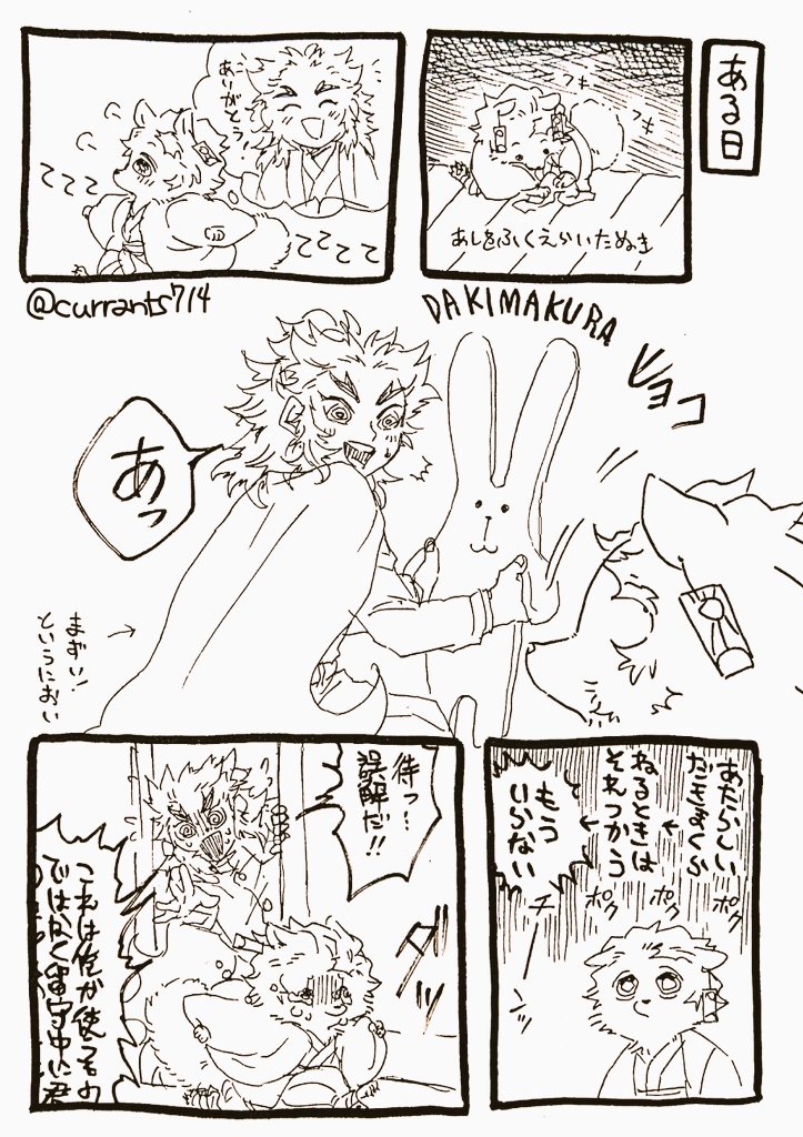 恩返し失敗ポン治郎 煉獄さんはポン治郎が一体何を持ってくるのか楽しみになってしまっている(別にどんぐりでも何も持っていなくても構わない) ※獣化