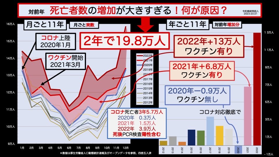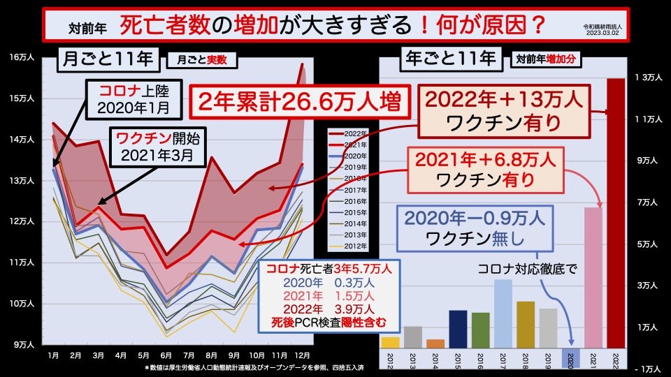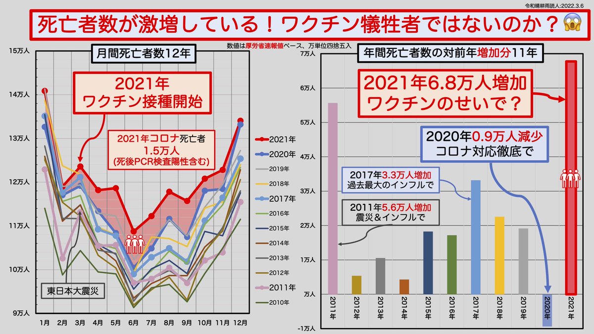 2020年コロナ対策を徹底したので死亡者数は減少した。にもかかわらず、2021年ワクチン投入してからはコロナ死をはるかに越える死亡者数。2022年も傾向は変わらず。片やコロナ対策はそのまま。おかしいと思わないか?これを無視していまだにワクチンを打てと言う厚労省。