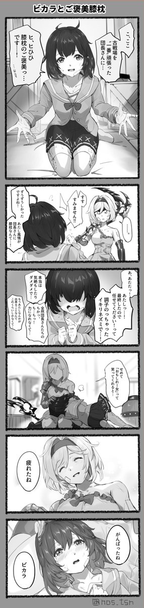 改めて闇古戦場お疲れ様でした! 今回激戦で疲れたので一番頑張った人に膝枕する話を描きました。 「古戦場のご褒美に膝枕をするビカラ」