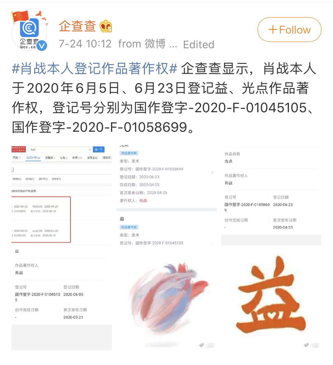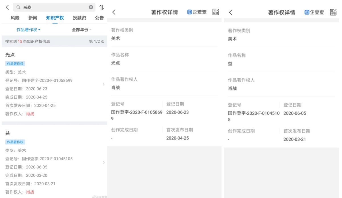 [200724] ฉี่ฉาฉาเปิดเผย วันที่ 5 เดือนมิถุนายน , วันที่ 23 เดือนมิถุนายน เซียวจ้านได้จดลิขสิทธิ์ 益 และผลงานเพลง 《光点》 โดยเลขที่จดคือ 国作登字-2020-F-01045105, 国作登字-2020-F-01058699