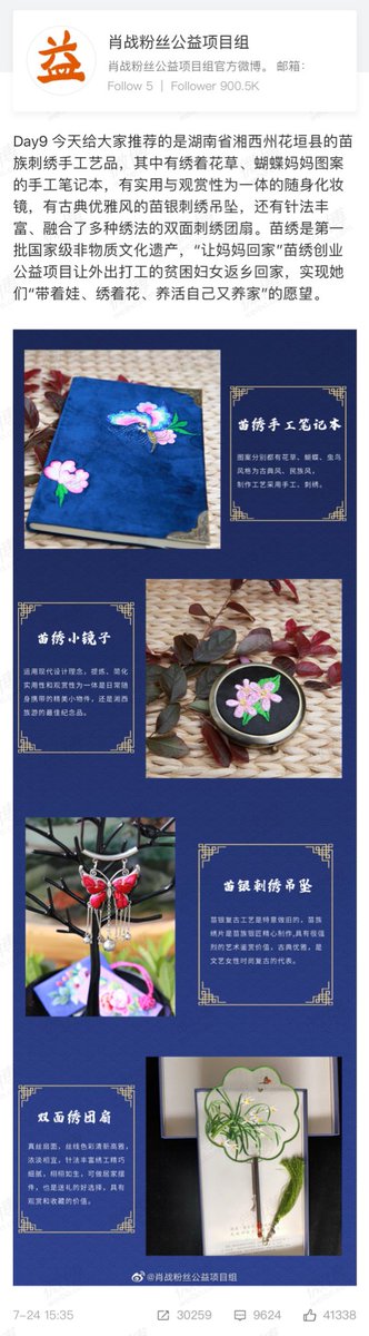 Day9 วันนี้ที่จะแนะนำให้ทุกคนคืองานฝีมือการเย็บปักถักร้อยของชาวแม้ว เขตฮวาหยวน เมืองเซียงซีมณฑลหูหนาน มีทั้งสมุดบันทึกปักลายดอกไม้และผีเสื้อ กระจกพกพา