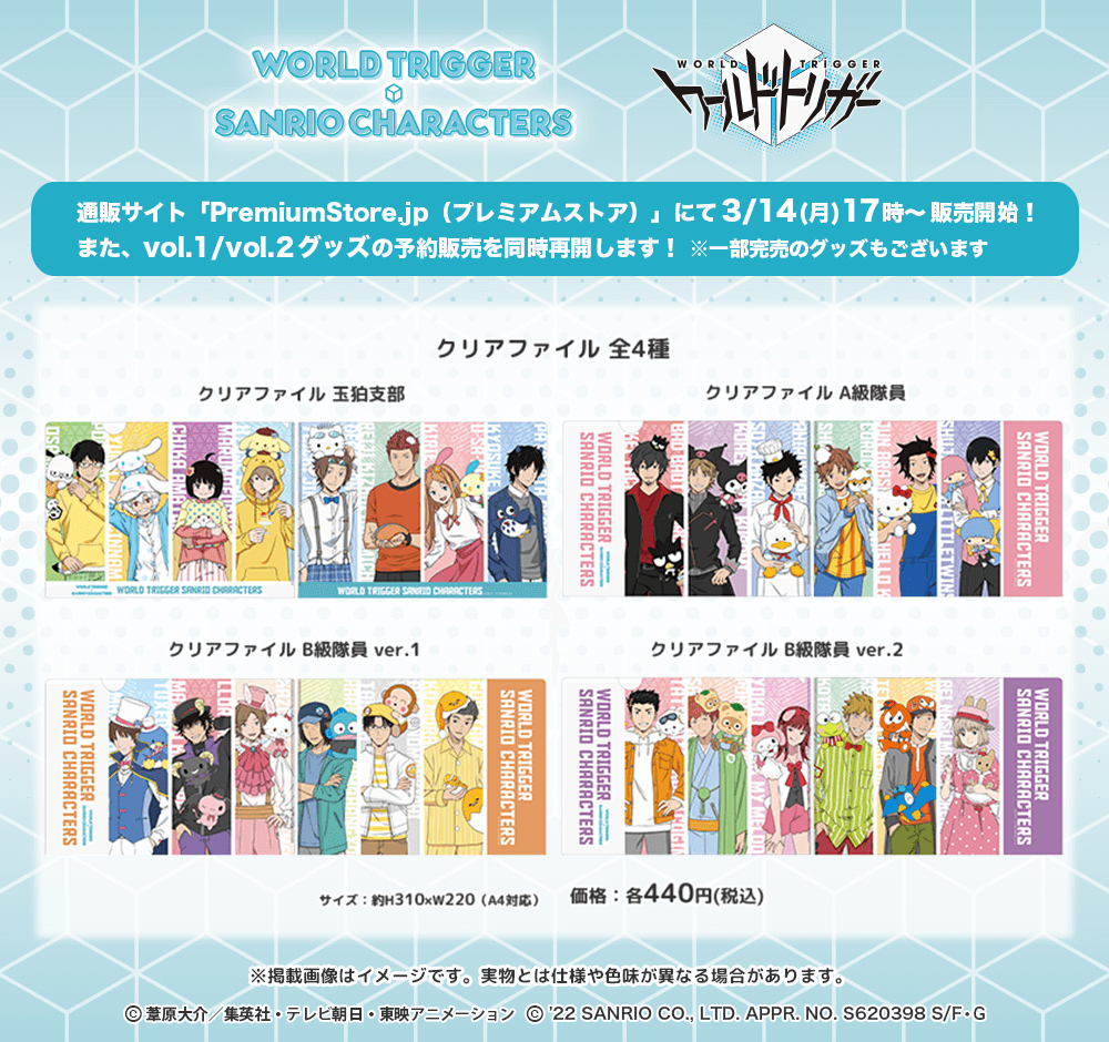 PremiumStore.jpにて『ワールドトリガー×サンリオキャラクターズ』アニメイラストを使用したクリアファイルを販売中です✨