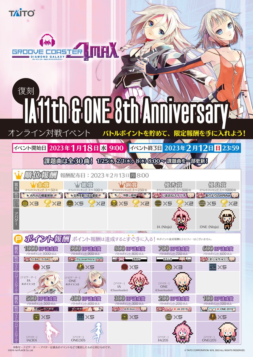 【AC】アーケード版グルーヴコースターで、1/18~2/12 まで「復刻 IA 11th & ONE 8th ANNIVERSARY オンライン対戦イベント」を開催✨