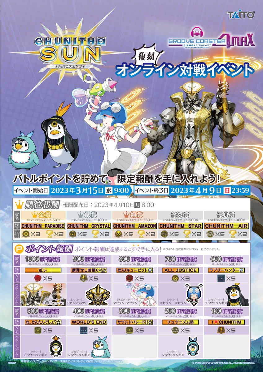 オンライン対戦でポイントを貯め、チュウニペンギンなどCHUNITHMの人気キャラのナビゲーター・アバターなど豪華報酬を手に入れよう🐧