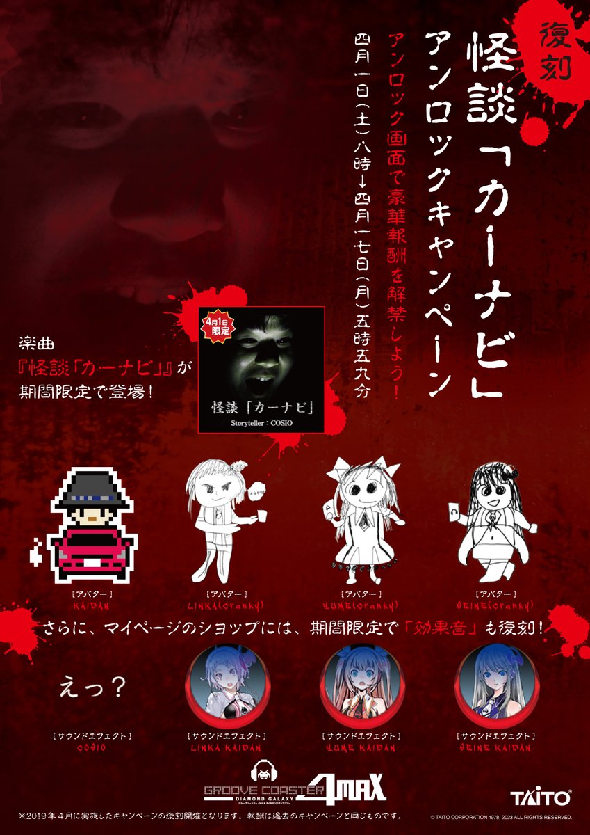 【え?】AC版グルーヴコースターで4/1(土)~4/17(月) 5:59の期間限定で「復刻 怪談「カーナビ」アンロックキャンペーン」開催🚗