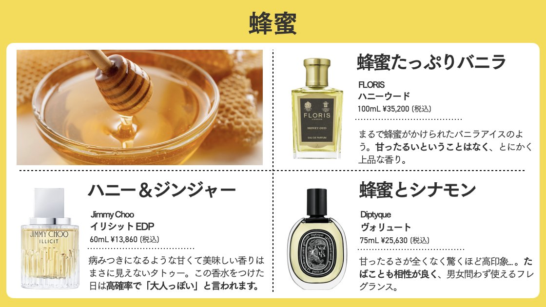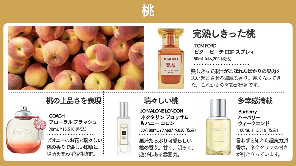 好まれ率の高い果物香水の中でも桃の香りの代名詞と言えばトムフォードのビターピーチ。新鮮な桃ではなく"熟しきって果汁がこぼれんばかりの果肉"を思い起こさせる甘い桃の香りが最高... フレグランス業界においては賛否両論があるとされているため、皆さんにも実際に手に取って試してほしい名香です💁‍♀️