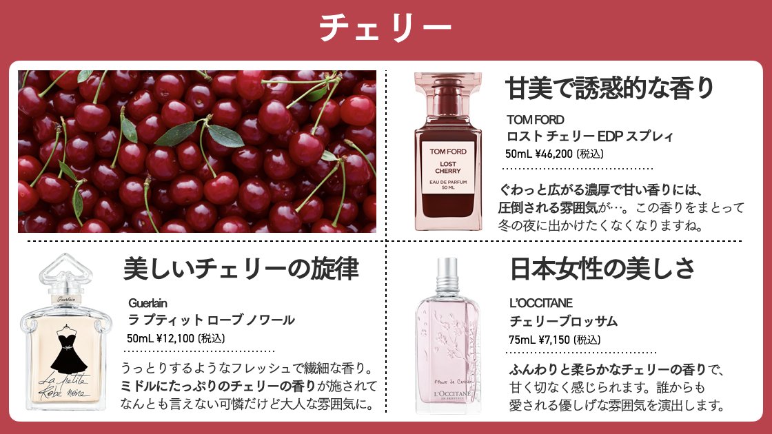 「人生で最高の赤色に染まりたい」そんな女性の欲望を叶えるために生まれたトムフォードのロストチェリー。溢れんばかりの"完熟したチェリーの果肉"をこれほどまでに堪能できる、その芳醇な香りはどこまでも官能的で誘惑的... 一度試したらその人気にも頷ける、愛らしくも魔性を感じる香水です💁‍♀️