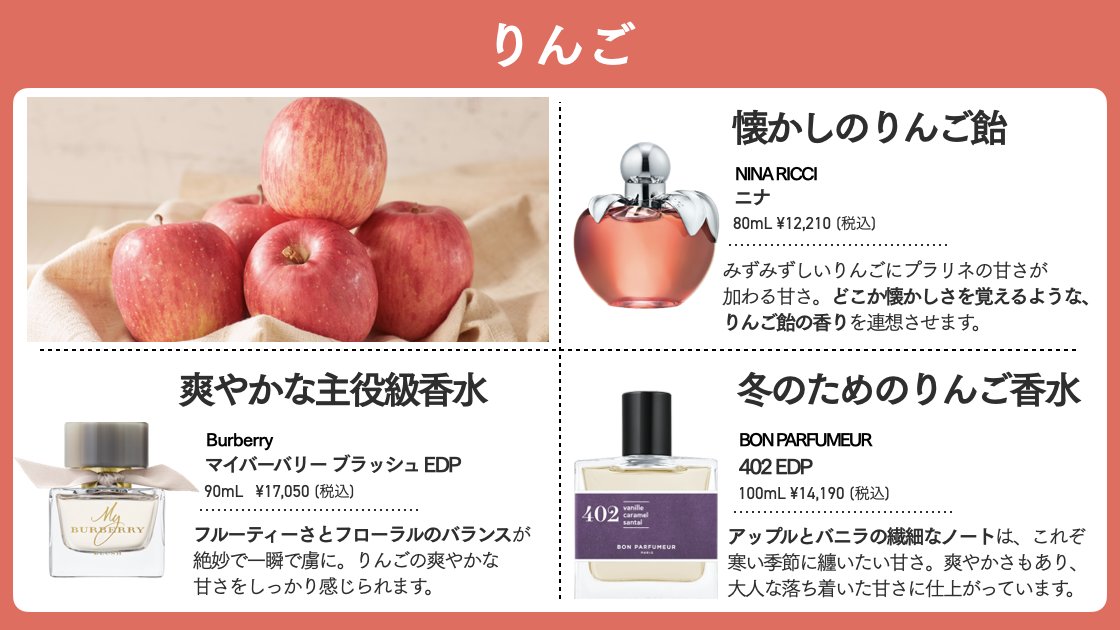 意外と秋冬に大優勝するりんご飴香水、ニナルージュ。マイルドなお砂糖と甘酸っぱいりんごの香りが、甘ったるすぎない程よい甘さを演出。だからといって子供っぽさはなく、ブラウンリップとブーツの上品な秋冬スタイルにぴったり。甘いのが苦手な人にも挑戦してみてほしいと思う名香です💁‍♀️