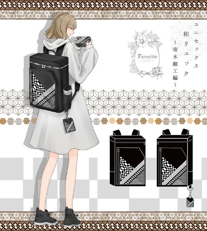 Favoriteオリジナル✨伝統工芸をアパレルに🇯🇵パスケース付き寄木細工風プリントスクエアリュック