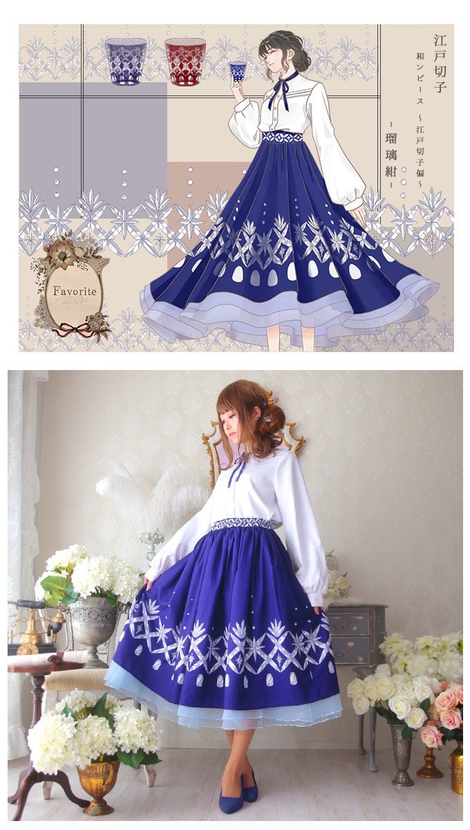 江戸切子スカート&リボン付きブラウスのコーデセット✨🇯🇵