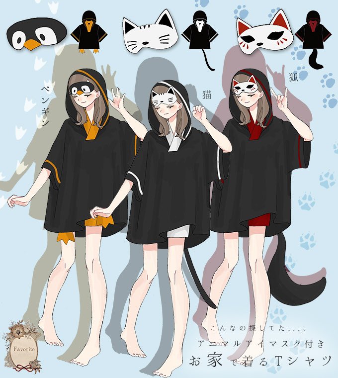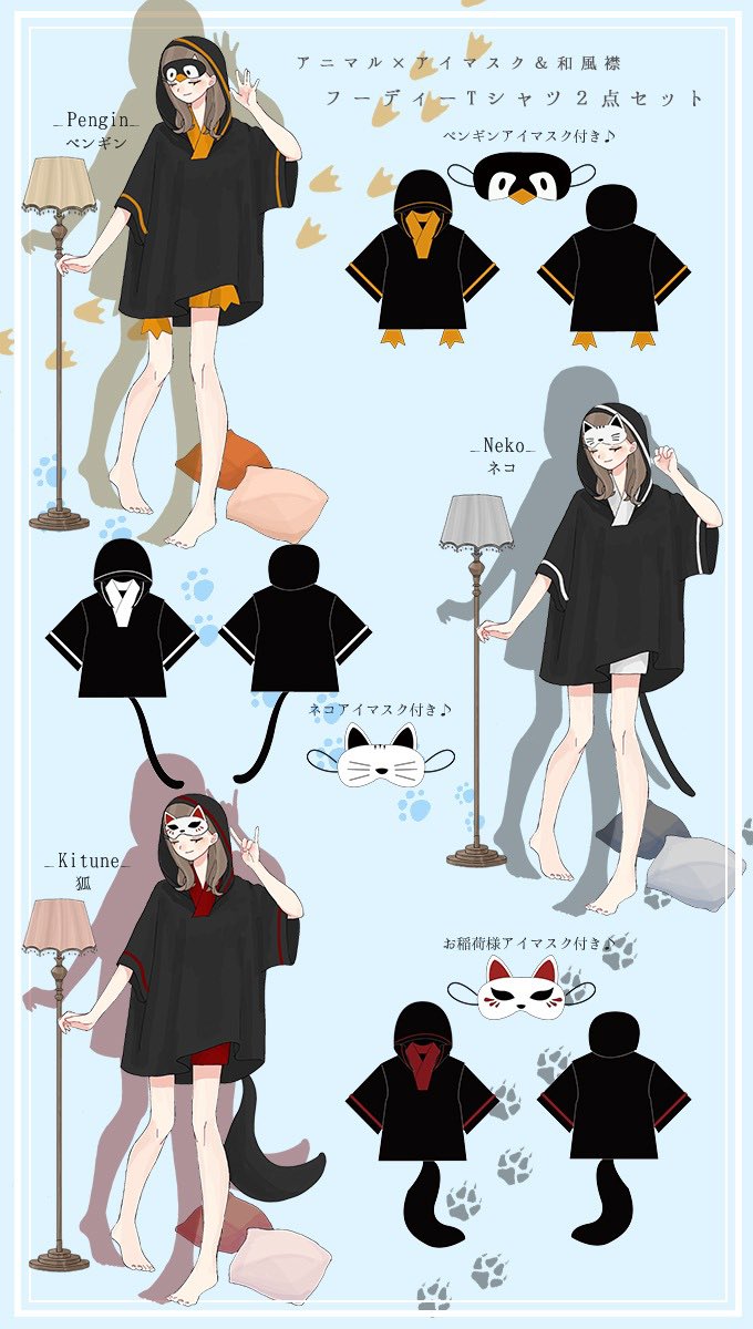 Favoriteオリジナル✨可愛いルームウェア🏠🏠🏠アニマル×アイマスク&和風襟のフーディーTシャツの2点セット🐧🦊🐱睡眠時の可愛いアイマスク💤💤💤