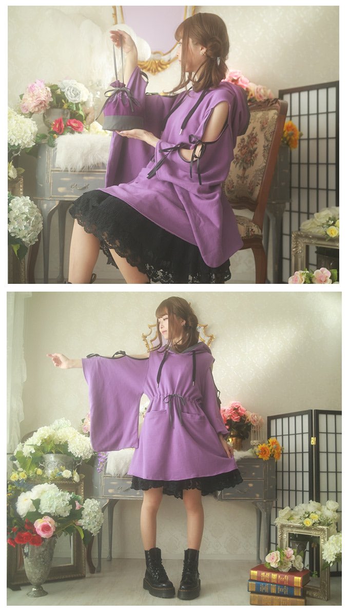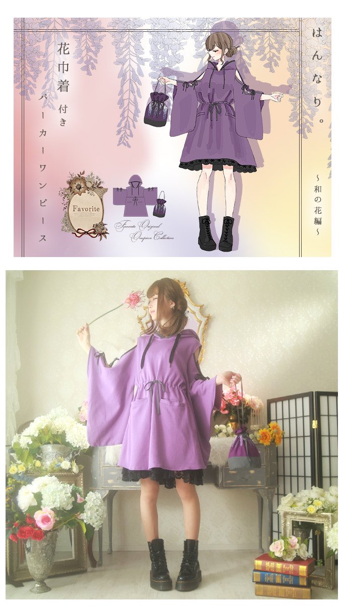 Favoriteオリジナル✨和洋折衷👘巾着バックでお出かけ*オフショル×和袖パーカーワンピース♪ 〜藤〜💜🌸