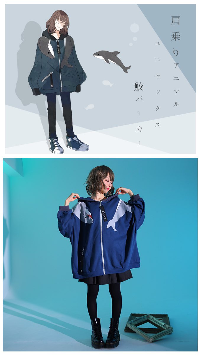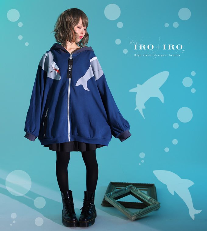 IRO+IRO🖤💙肩に乗る大きな鮫プリントのBIGシルエットパーカー🦈🦈🦈