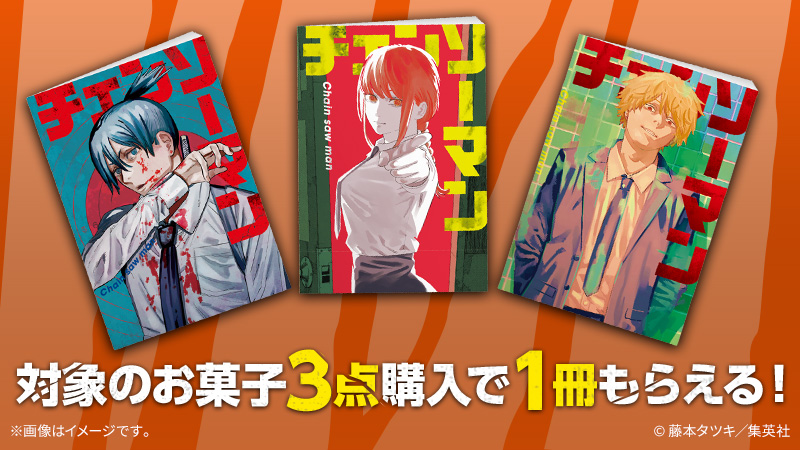 【予告】7/5~「チェンソーマン」キャンペーンスタート♪対象のお菓子を買うと先着・数量限定で単行本風ノートがもらえる企画などを実施します(^^)