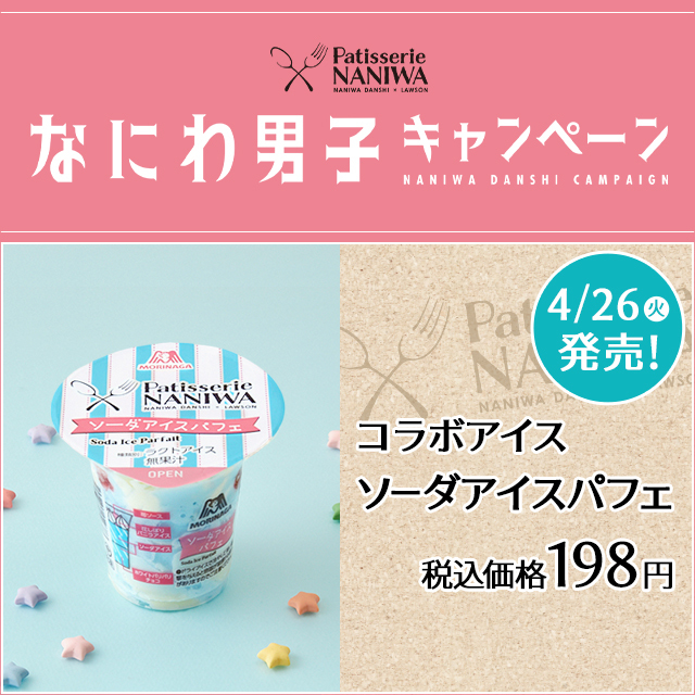 本日より「なにわ男子」とコラボしたソーダアイスパフェが発売♪パリパリのホワイトチョコレート入りソーダアイスの上にバニラアイスと苺ソースをあしらったパフェアイスです(^^)
