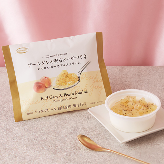 暖かい部屋で食べたい「アールグレイ香るピーチマリネ」が新発売♪マスカルポーネを使ったアイスにアールグレイ茶葉をまぶした白桃の相性がばっちりです(^^) #ローソン