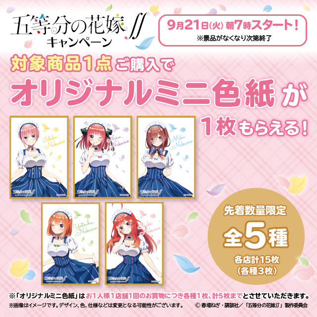 【予告】明日朝7時より TVアニメ『五等分の花嫁∬』キャンペーンスタート♪対象のドリンク剤を1点購入すると先着数量限定でオリジナルミニ色紙がもらえます(^^) #ローソン #五等分の花嫁