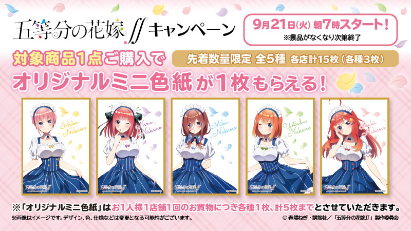 【予告】明日朝7時より TVアニメ『五等分の花嫁∬』キャンペーンスタート♪対象のドリンク剤を1点購入すると先着数量限定でオリジナルミニ色紙がもらえます(^^) #ローソン #五等分の花嫁