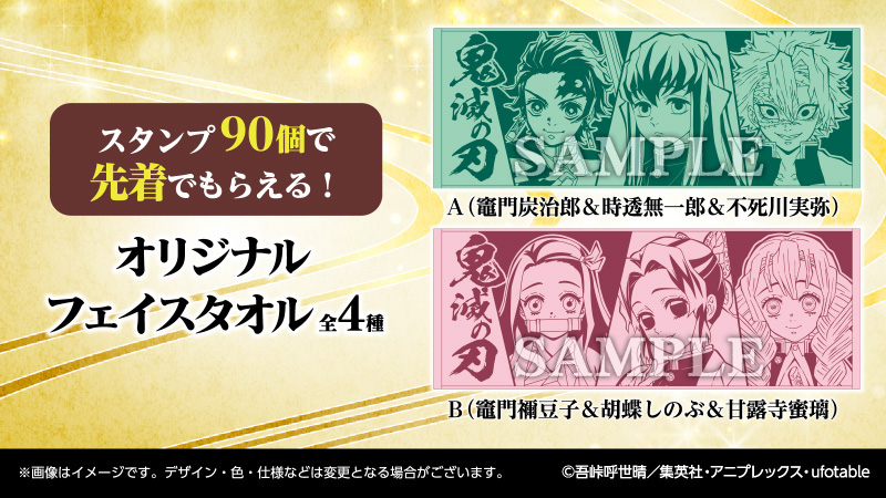「鬼滅の刃」たまるよスタンプ開催中♪スタンプをためると、先着でオリジナルフェイスタオルがもらえるほか、WEBエントリーで景品が当たります。ポイントカード会員限定です(^^)