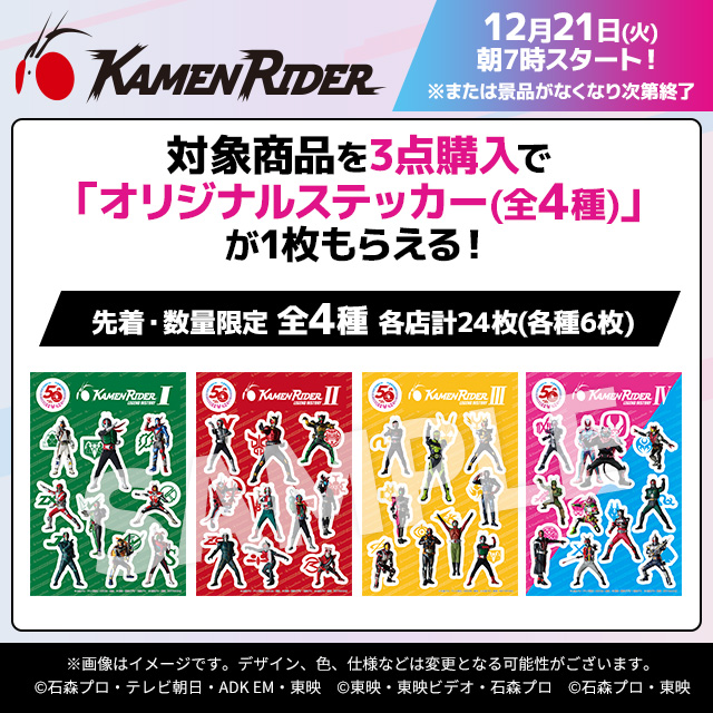 【予告】12/21から仮面ライダー50周年記念仮面ライダーキャンペーン開始♪対象のお菓子を3個購入ごとに先着数量限定でオリジナルステッカー(全4種)がもらえます(^^)