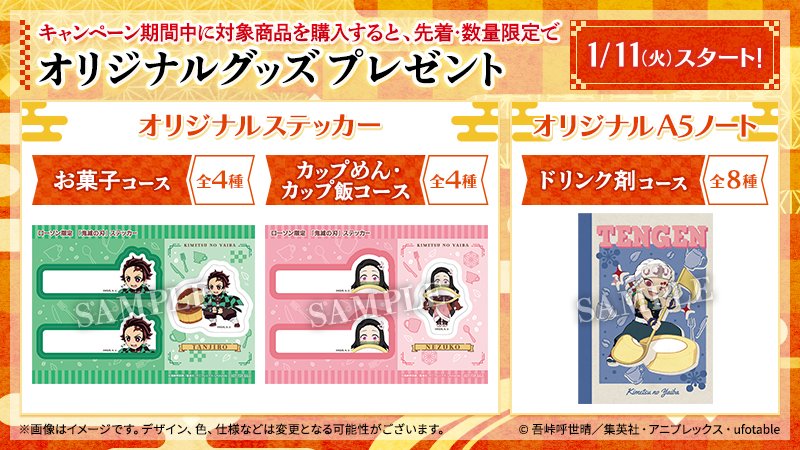 【予告】 1/11~ 「鬼滅の刃」キャンペーン順次開催♪先着・数量限定でオリジナルグッズがもらえる企画など実施します。本日より「宇髄天元」のオリジナル店内放送が聞けます(^^) #ローソン #鬼滅の刃