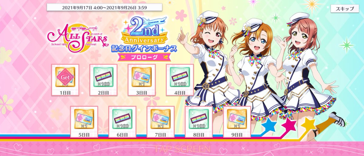 2周年当日まで毎日ログインすることで、無料で90回ガチャが回せる🎶