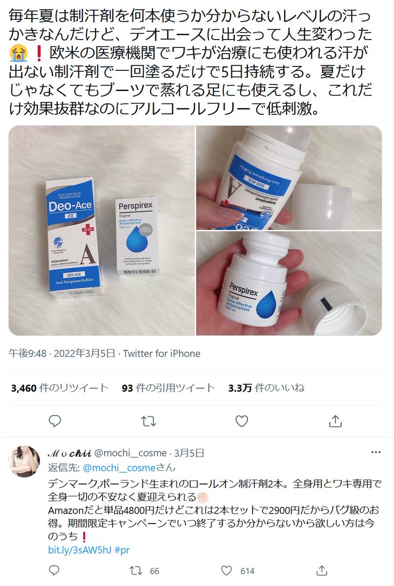 制汗剤『デオエース』の宣伝が目立ちますね。1件1200円超の報酬が出るケースもあるようで、2ツイート目以降の気が付きにくい場所にこっそり「PR」と表記されています。