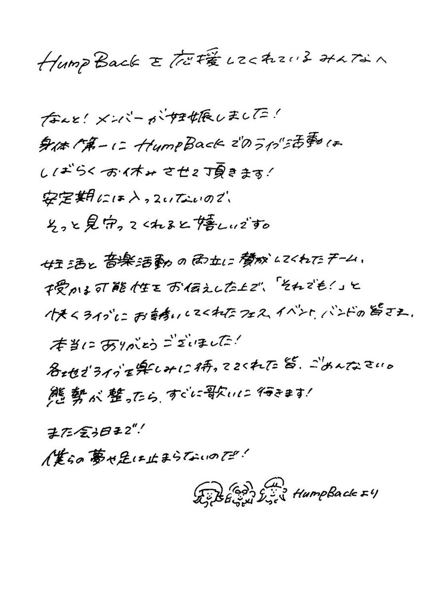 ガラガラのライブハウスでCD1枚も売れへんくて、今日も結局どうにもならんかった、明日にはどうにかなってくれっていうあの頃の情けない気持ちをただひたすらに書いた歌やのに、みんなが前向きに捉えてくれて不思議な気持ち。聴いてくれてありがとね〜。 twitter.com/_humpback_/sta…