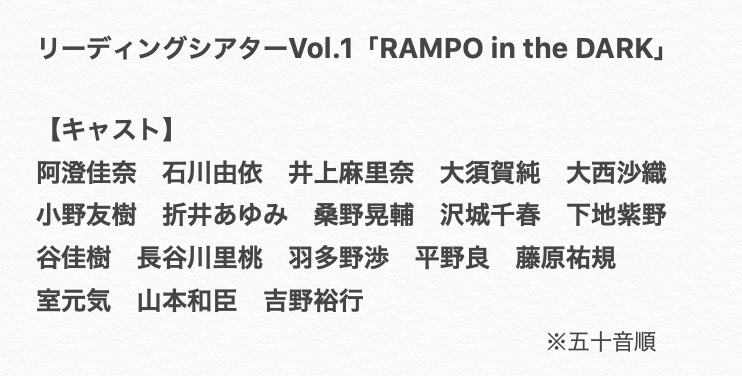 リーディングシアターVol.1「RAMPO in the DARK」 2020年6月10日(水)〜神田明神ホール。江戸川乱歩の世界を朗読劇にて上演!公式HP cccreation.co.jp/stage/rampo-in…