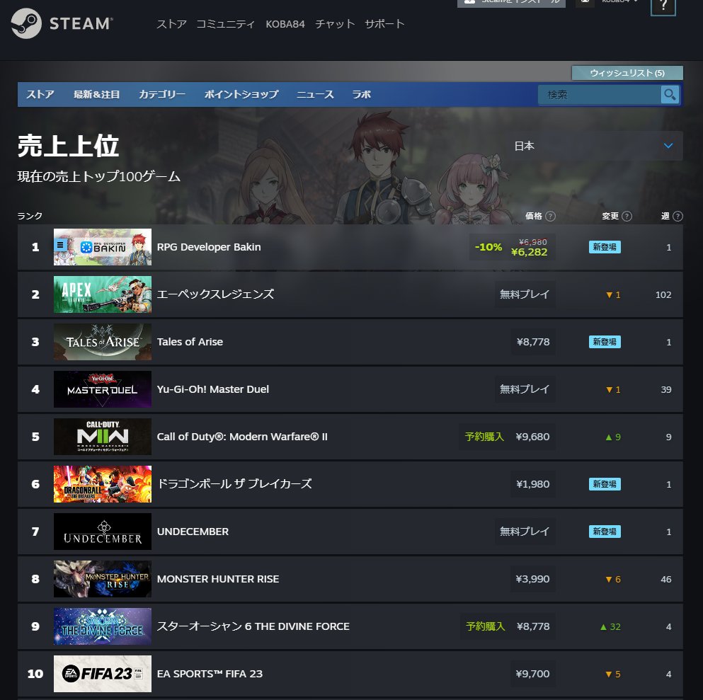 STEAM売上1位に RPG Developer Bakin が!開発メンバー感動しつつ初日に発生した問題対処中です。たくさん売れると利用者が増える喜びと予想もしない問題が発生する恐怖がセットで体感できるのがツール開発&販売の醍醐味。お客様との交流で良い商品に育てます!