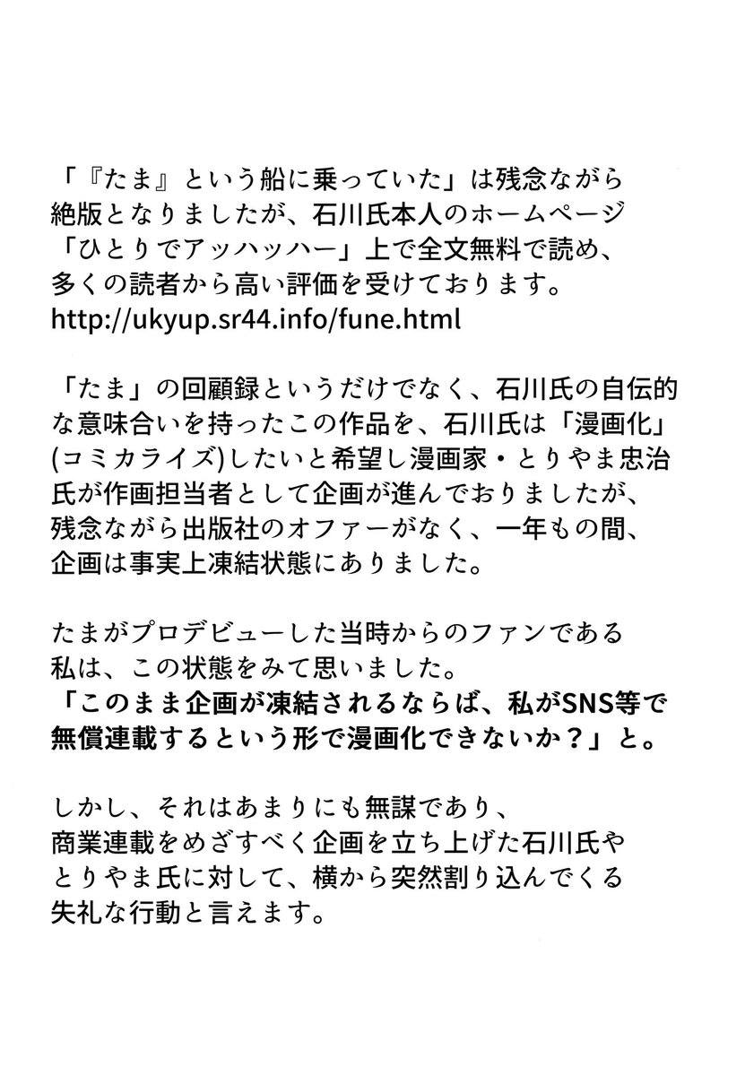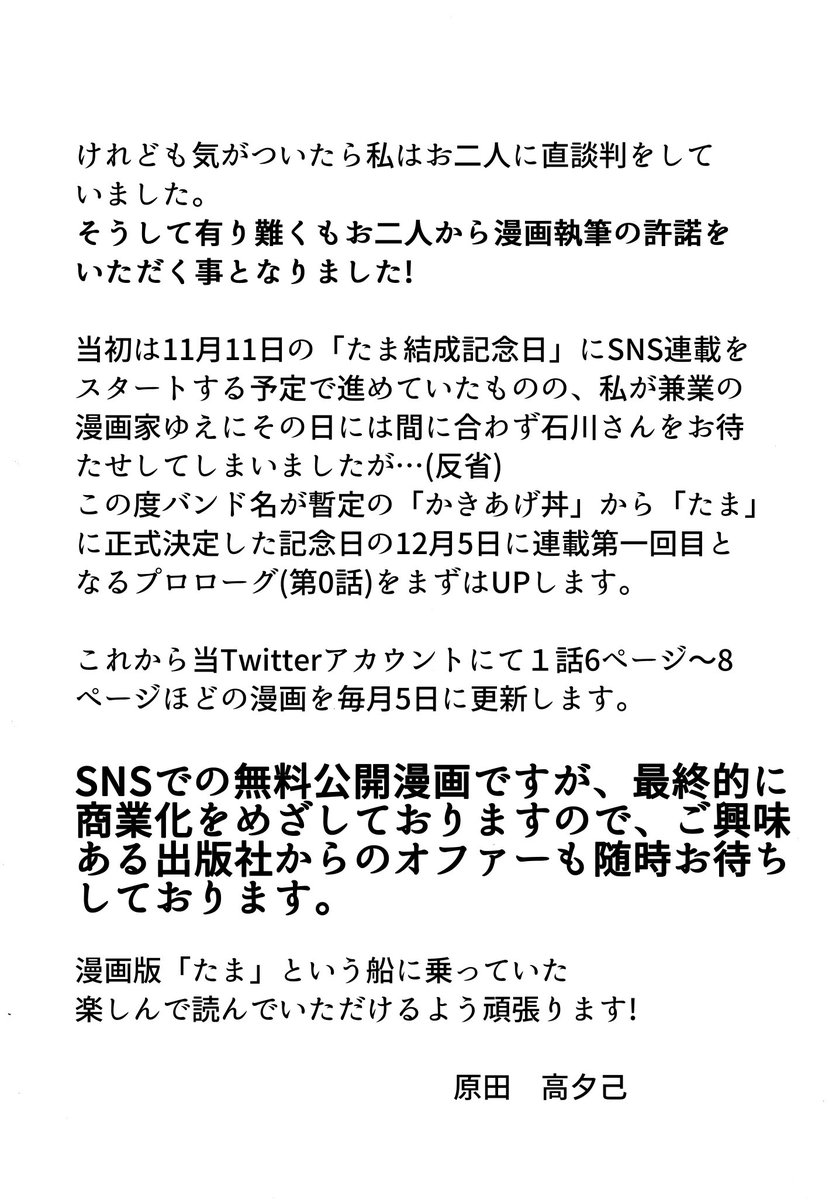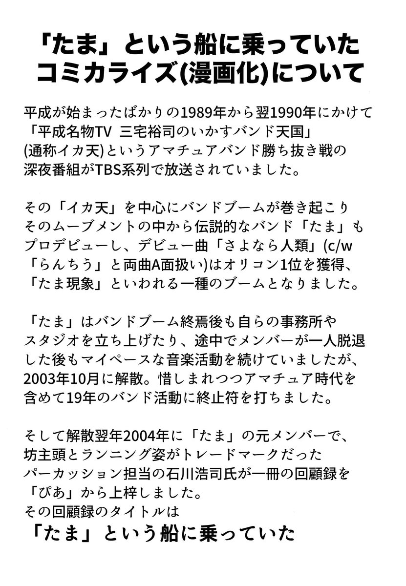 石川浩司さん原作、原田高夕己作画の漫画版『「たま」という船に乗っていた』の単行本第一巻が7/21に双葉社より発売される事が決定しました!