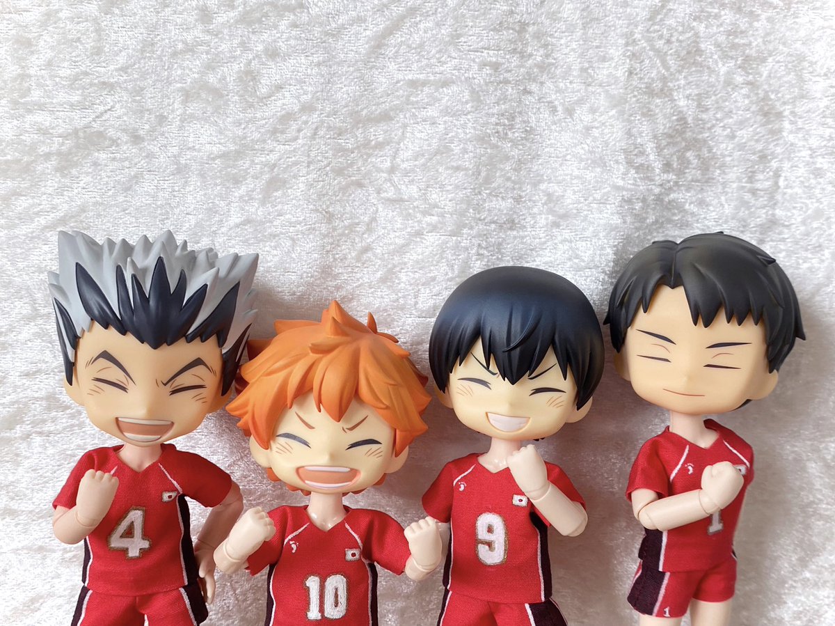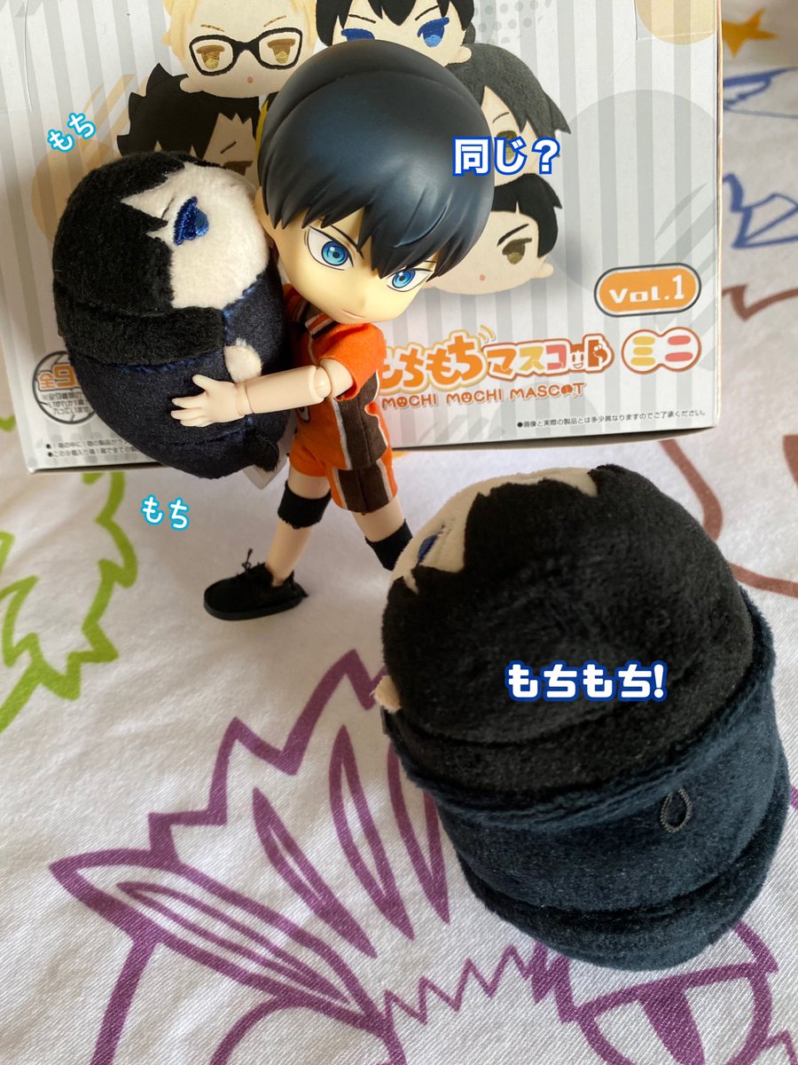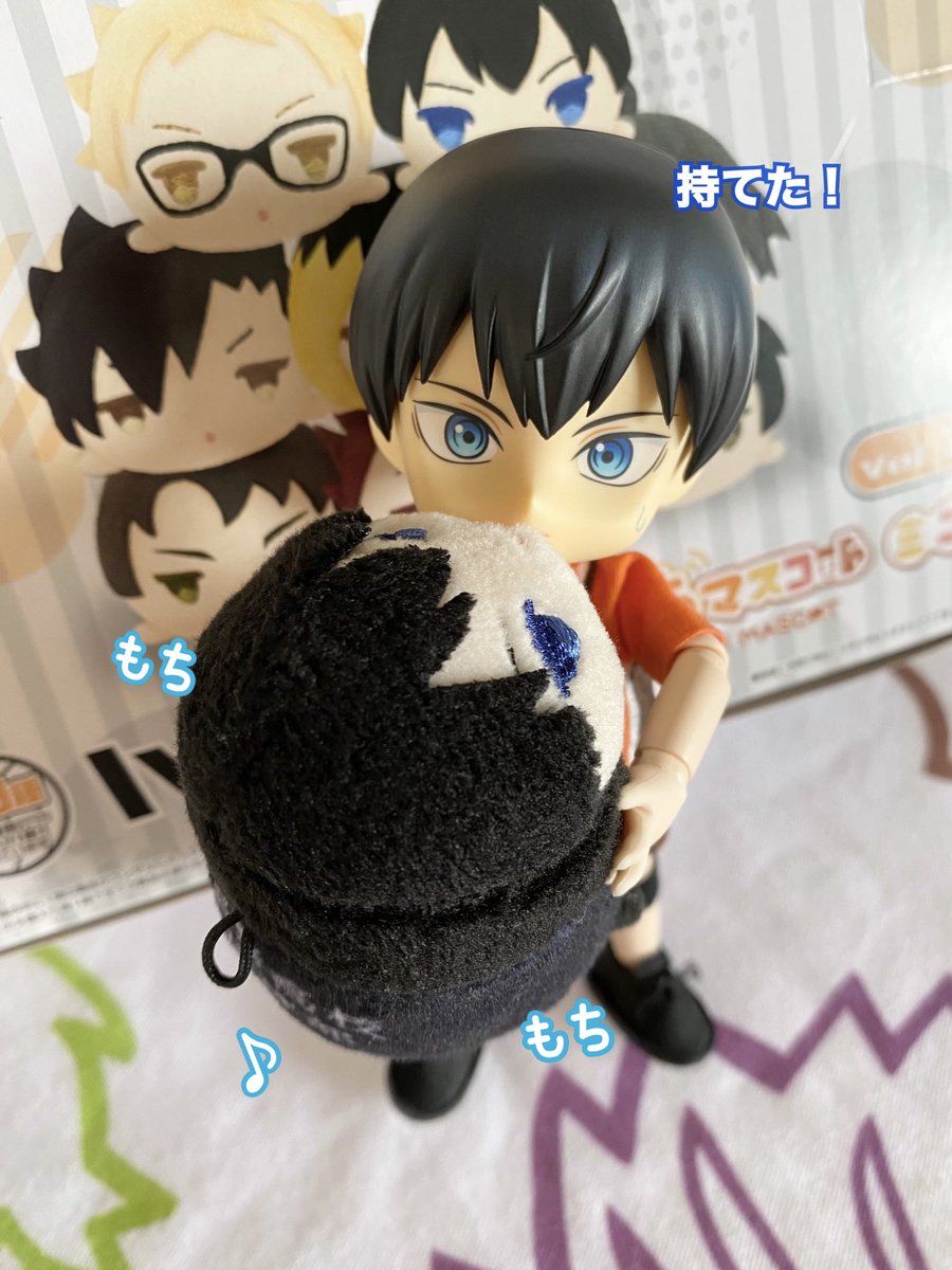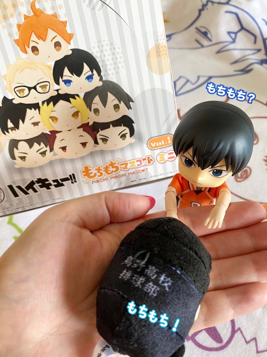 ミニちゃん届いた! こんなにちっちゃいの!?ってびっくりです 特典日向が届いたらミニちゃん全員で撮りたい 一足先にミニもちとびおで影山に大きさを比べてもらいました🫶