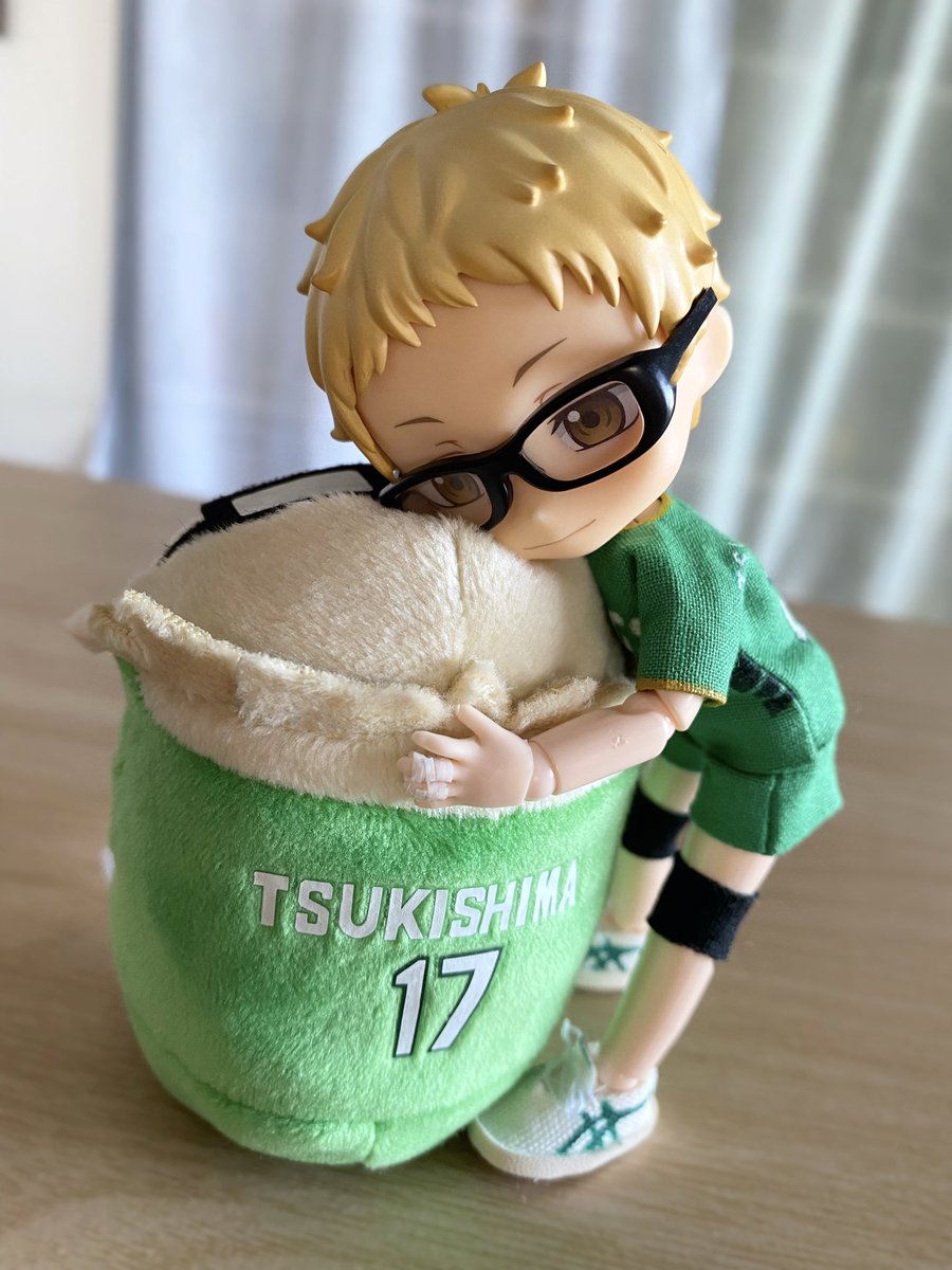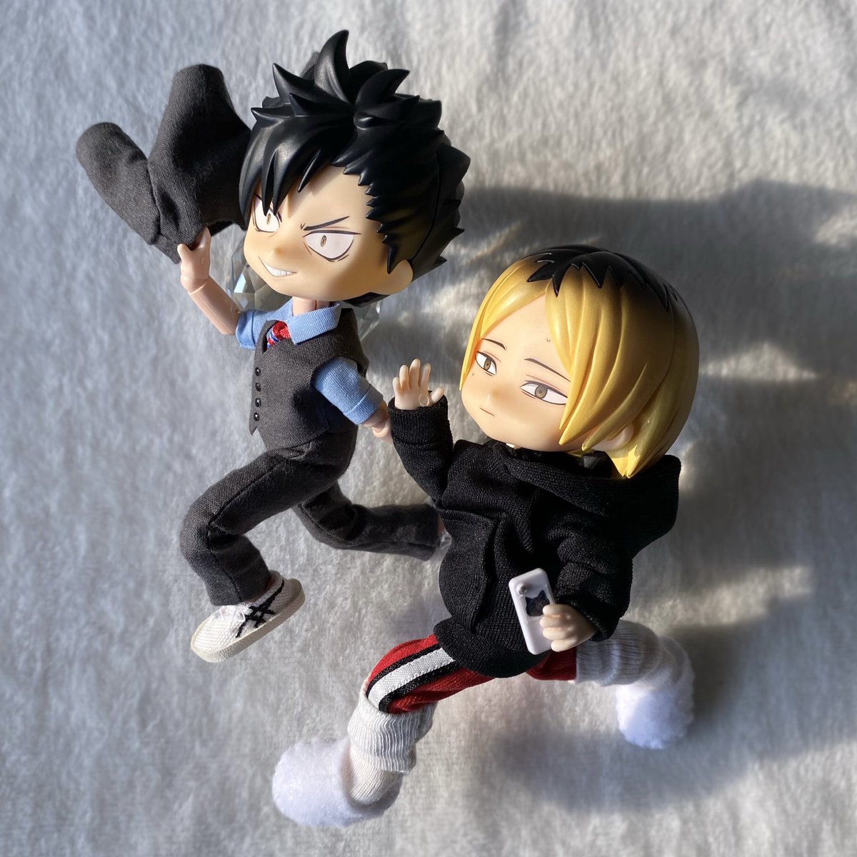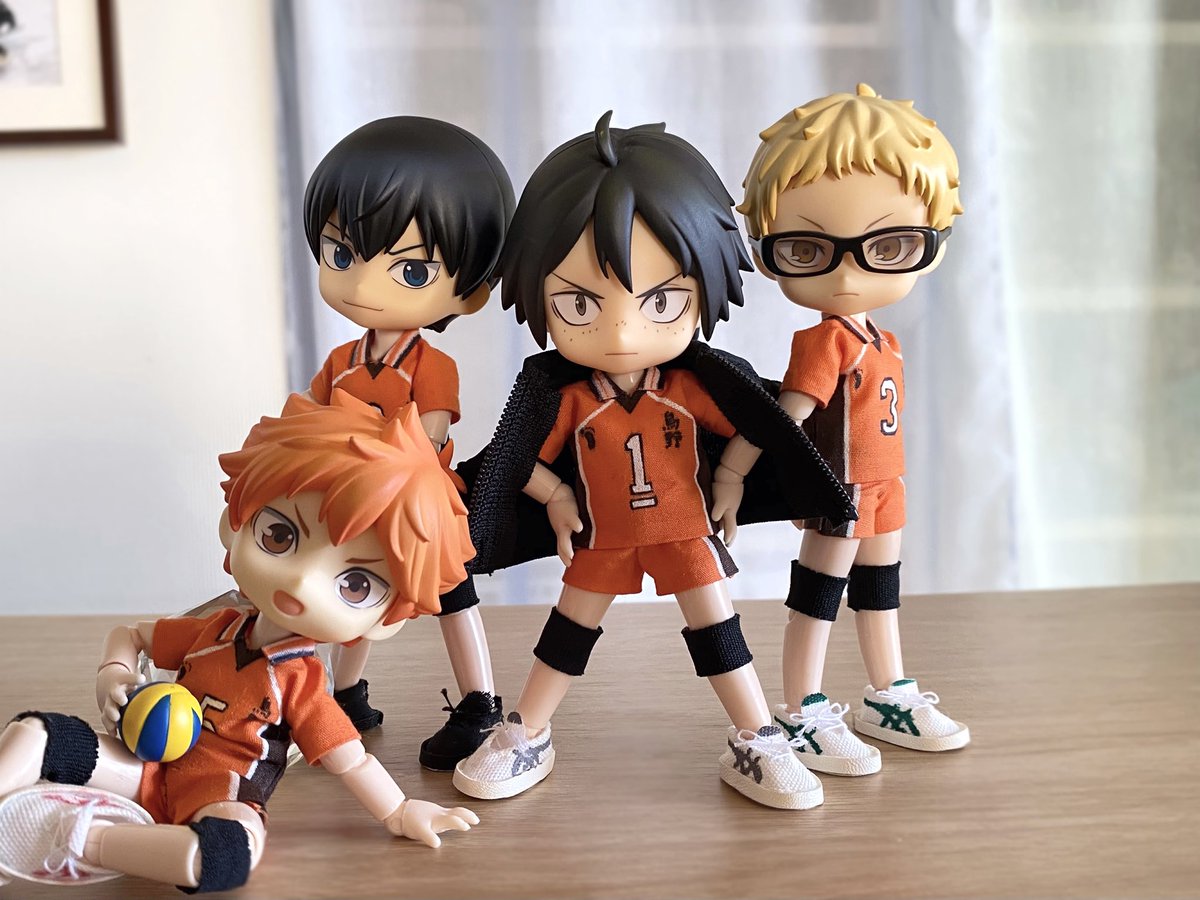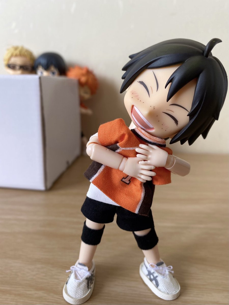 ミニちゃん届いた! こんなにちっちゃいの!?ってびっくりです 特典日向が届いたらミニちゃん全員で撮りたい 一足先にミニもちとびおで影山に大きさを比べてもらいました🫶