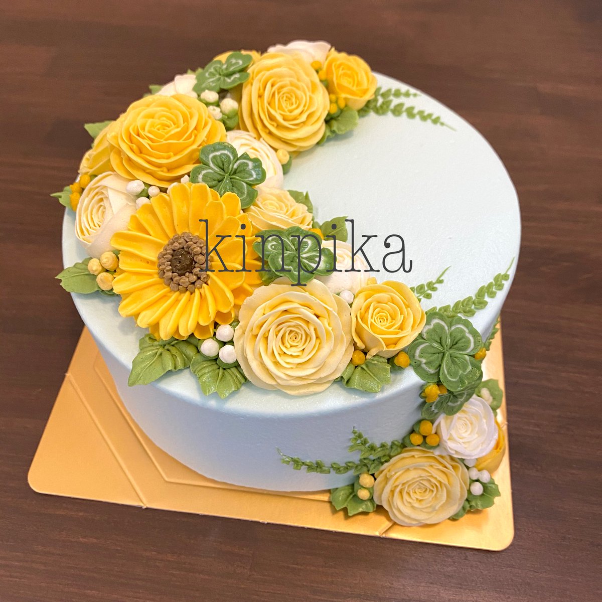淡い水色のケーキ。 淡〜い色はクリーム自体のわずかな黄色の影響を受けやすいので色を作るのがものすごく気を使います。 シンプルになればなるほど 絞りの作りに目が行くのでドキドキします。