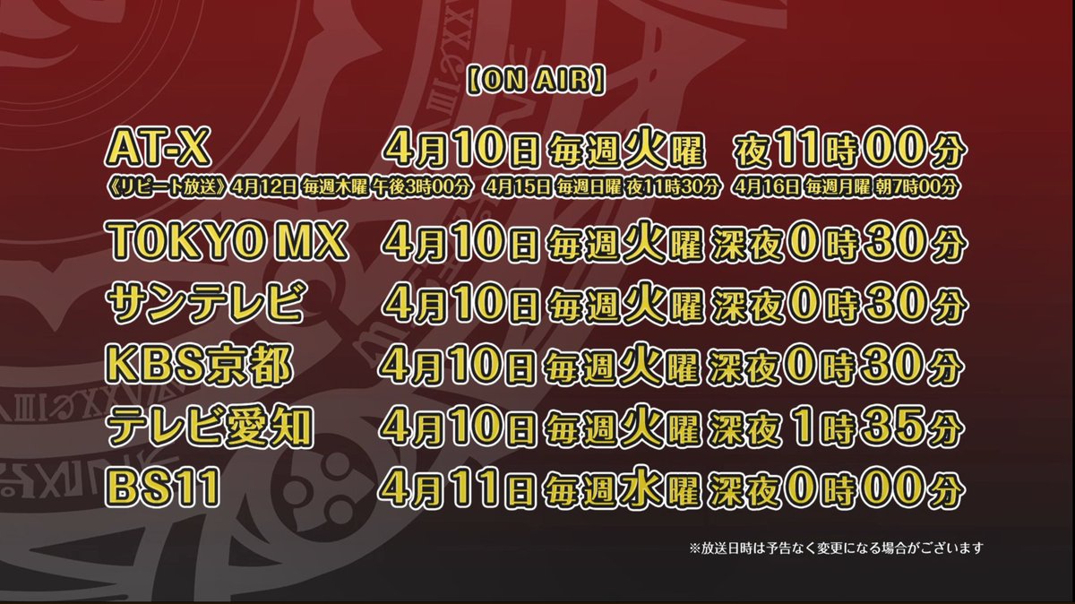 ♡AT-X:夜11時~♡TOKYO MX:深夜0時30分~♡サンテレビ:深夜0時30分~
