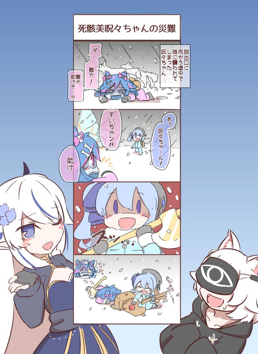 すいちゃんの40万人記念凸待ちで呪々ちゃんが話してたエピソードこんな感じだろうかという4コマ