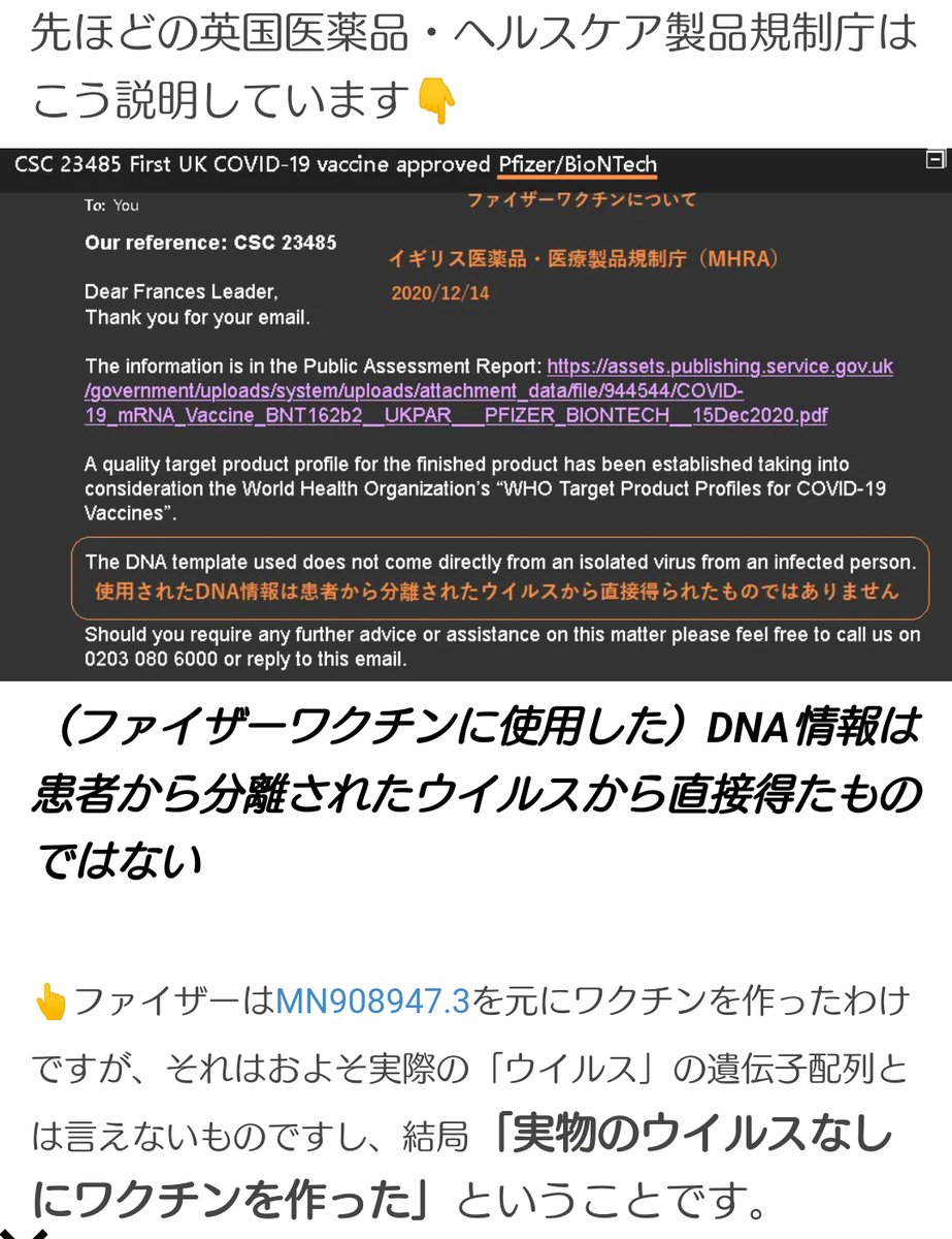 「新型コロナウイルスは本当に実在するのか」という根本的な問題がありますが、少なくとも、現在接種されているコロナワクチンは実物のウイルスから情報を得たものではありません